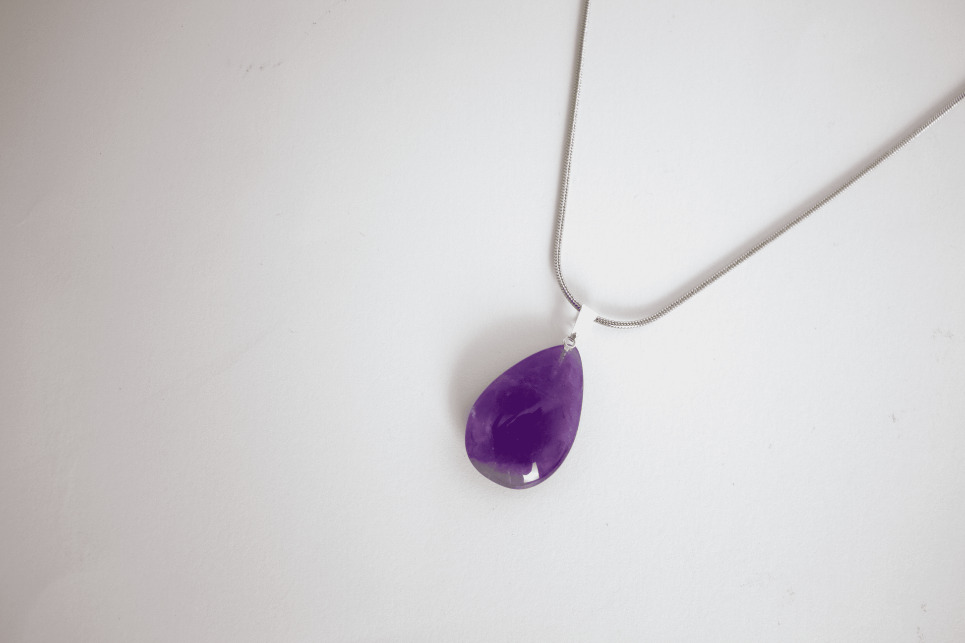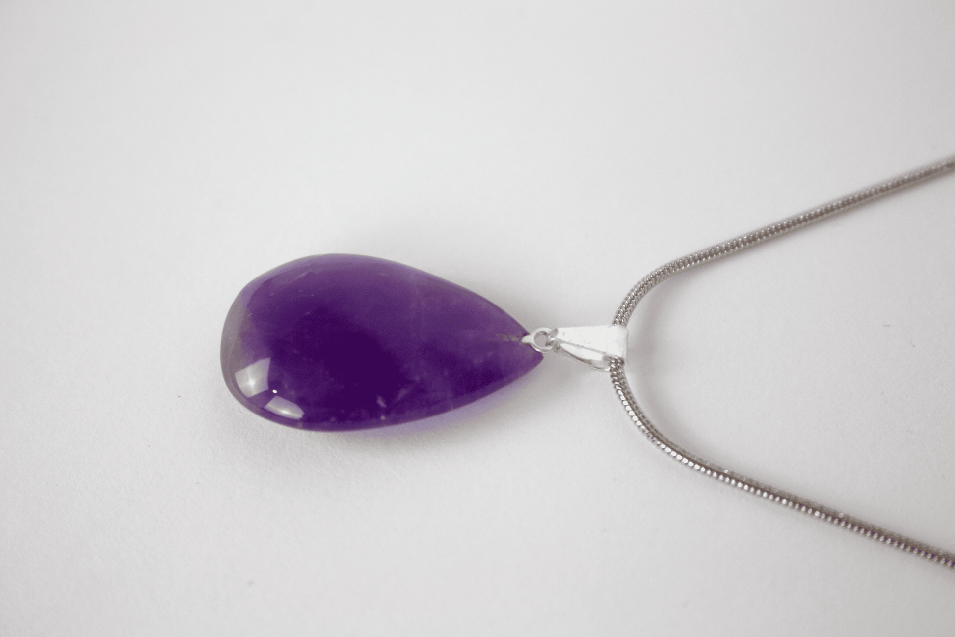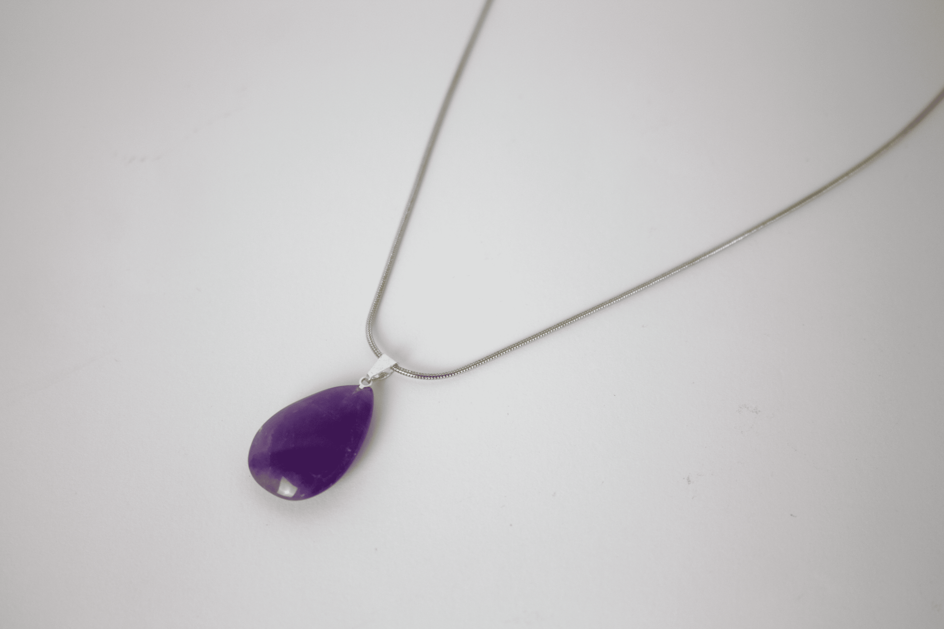 Amatista natural · Forma gota · Energía vibracional elevada · Acero inoxidable bañado en Plata 925 · Longitud Cadena 45 cm